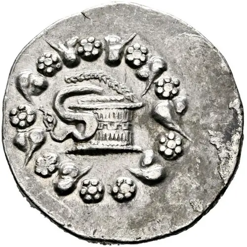 | Obverse description | Cista mystica with serpent; all within ivy wreath. |