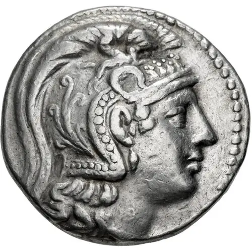 | Описание аверса | Helmeted head of Athena Parthenos right. |