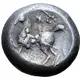 Descrizione del rovescio Stylised rider on horseback to left; wreath above, three pellets either side of rider`s leg.