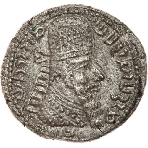 | Obverse description | A portrait of the king facing right, in Parthian-style headdress (kulah) edged along the borders with tow rows of `pearls`. There is an ornament made of `pearls` on the kulah. The central ornament is a six-pointed star. The hair covered by bashlyk edged with `pearls`, and ribbons with bows flow out from the kulah. Around his neck the King wears a necklace in the form of tow hoops. There is a pointed rim around the picture. |