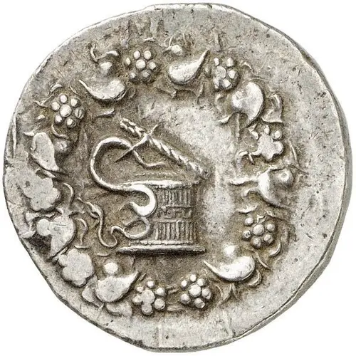 | Obverse description | Serpent emerging to left from a partially open cista mystica; around, ivy wreath. |