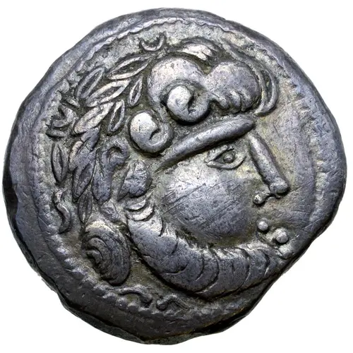| Описание аверса | Celticised, laureate and bearded head of Zeus to right. |