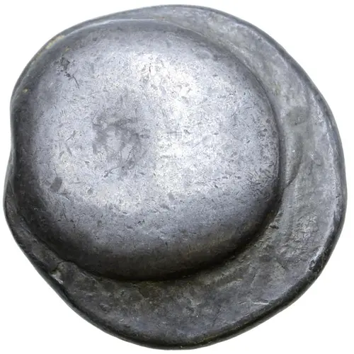 | Descrição do reverso | Heavily stylised horse prancing to left; five pellets above; top of cone visible below |