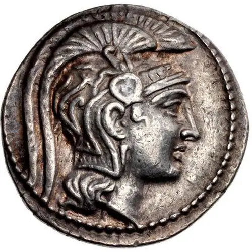 Описание аверса Helmeted head of Athena right.