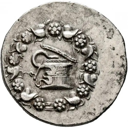 | Popis líce | Cista mystica from which snake coils; around, ivy wreath with fruits. |