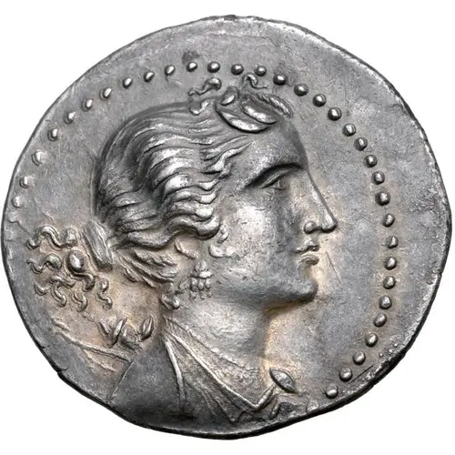 | Opis awersu | Bust of Artemis to right, hair tied with a ribbon behind, wearing necklace, pendant earring and chiton fastened on far shoulder with ornamental pin; bow and quiver over her left shoulder. |