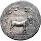 | Opis rewersu | Bull standing to right, head facing and adorned with fillet, city name above, magistrate name in exergue; all within laurel wreath. |