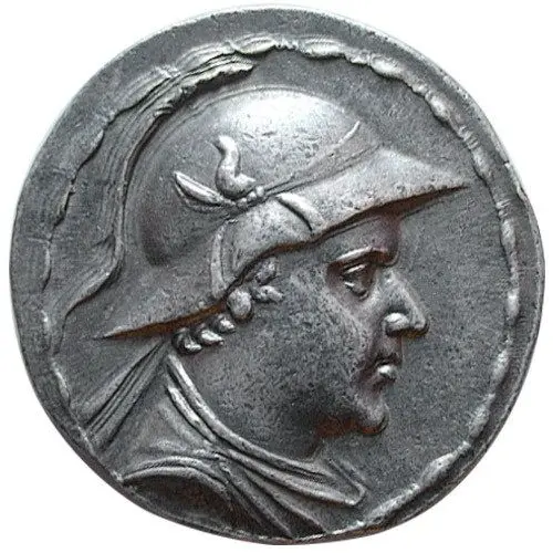 | Descripción del anverso | Diademed and draped bust to right, wearing crested helmet adorned with bull`s horn and ear. |