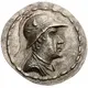Diademed and draped bust of Eukratides to right, wearing Macedonian helmet adorned with bull’s horn and ear |