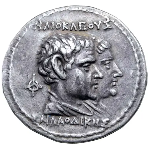 Jugate draped busts of Heliokles and Laodice to right, HΛIOKΛEOYΣ above, KAI ΛAOΔIKHΣ below; monogram behind. |