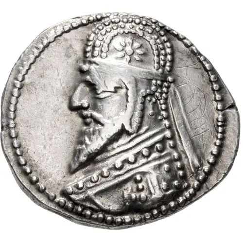 | Opis rewersu | Archer (Arsakes I) seated right on throne, holding bow; A to inner left; H to inner right; palm to outer right. |