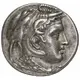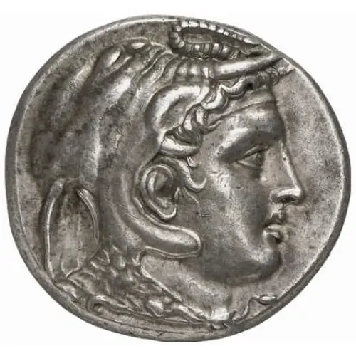 | Mô tả mặt trước | Head of the deified King Alexander III facing right, wearing elephant headdress, scaly aegis around neck, and horn of Ammon at temples. |