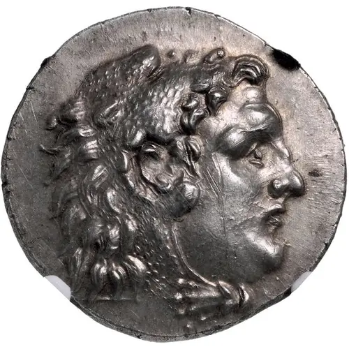 Head of beardless Heracles right wearing lion skin headdress. |