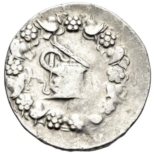 | Obverse description | Serpent emerging to left from a partially open cista mystica; around, ivy wreath. |