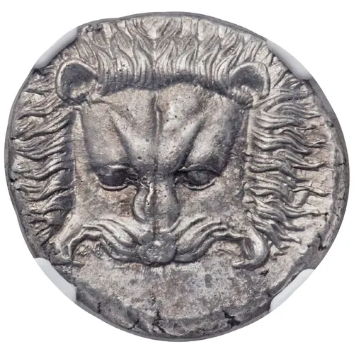 | توضیحات روی سکه | Lion`s scalp splayed out and viewed from above. |