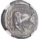 | توضیحات پشت سکه | Forepart of bull facing right, bridled, olive-branch behind, magistrate name above, monogram below, all within incuse square. |