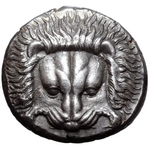 | Arka yüz açıklaması | Forepart of ox to right, wearing an ornamental collar and with a dotted truncation, olive branch to left; magistrate name above, ΣA and bee below, all within incuse square. |