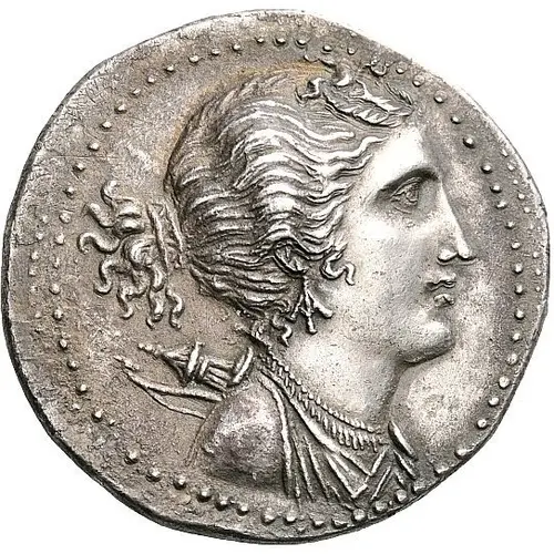 | Obverse description | Bust of Artemis to right, her hair tied with a ribbon behind, wearing a necklace, a pendant earring and a chiton, and with her bow and quiver over her left shoulder |