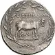 | Reverse description | Steer standing right, its head, adorned with a taenia, turned towards the viewer. All within laurel wreath |