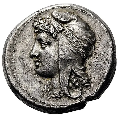 | توضیحات روی سکه | Uncertain female head to left (Dido or more probably Tanit), wearing a necklace and a Phrygian cap that is encircled with a band embroidered with palmettes and tied above her forehead |