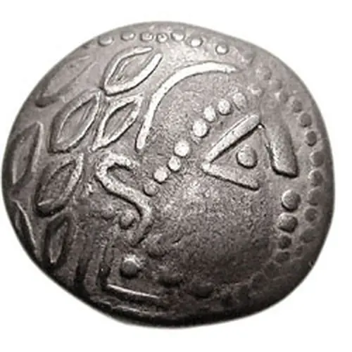 | Popis líce | Interpretation in local style of head of Zeus right. Large eyes and wedged nose. Hair and laurel wreath in the shape of hollow leaves. Pearl line for the beard and on forehead, with arc behind. Ear in the form of an `S` |