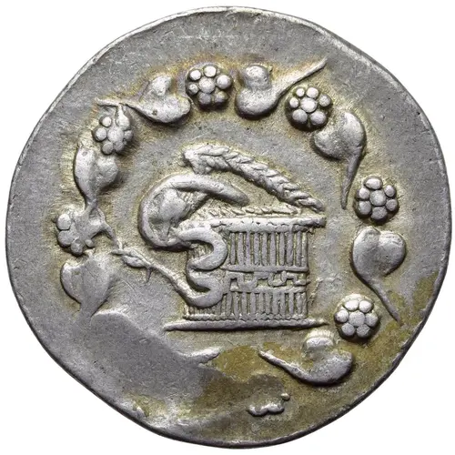 | توضیحات روی سکه | Cista mystica with serpent; all within ivy wreath. |
