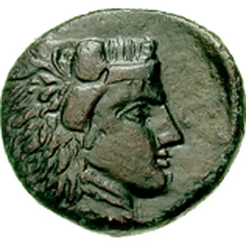 Descripción del anverso Head of Herakles right, wearing lion`s skin headdress