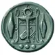 | Descrição do reverso | Tripod with three ring handles and lion’s feet; behind, lyre; to left and right, barley grain; below, three pellets. |