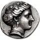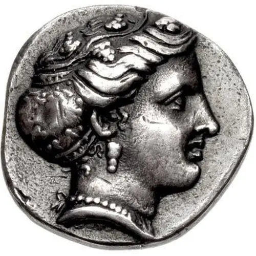 | توضیحات روی سکه | Head of the nymph Histiaia right, hair bound in ornate sakkos, wearing ivy wreath with grape bunches, single-pendant earring, and pearl necklace. |