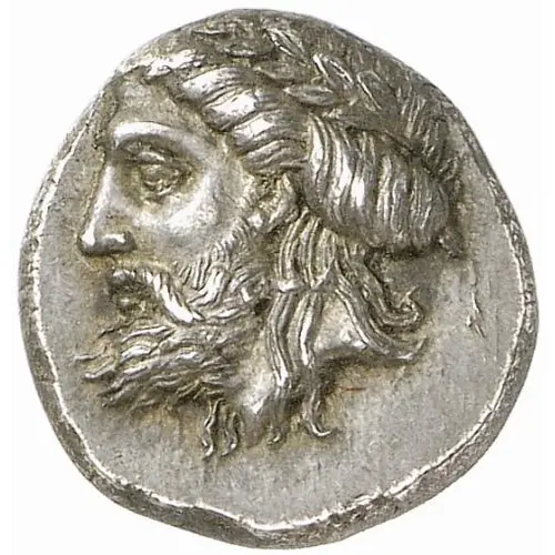 | 表面の説明 | Laureate head of Zeus to left, his hair partially rolled at the back of his head but with some locks falling down below the neck truncation on both sides of his head |