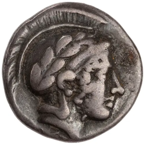表面の説明 Head of Athena to right, wearing crested Attic helmet ornamented with wreath.