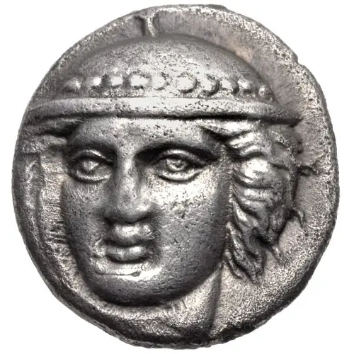| Aversbeschreibung | Head of Hermes facing slightly left, wearing petasos with studded rim. |