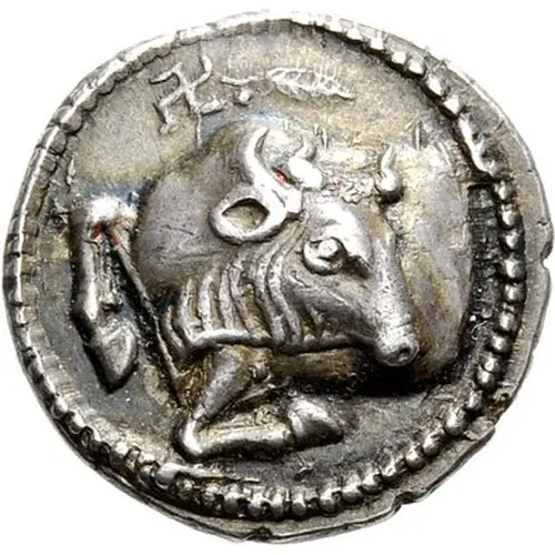 | Obverse description | Forepart of bull to left, head turned back to right. Above, swastika left and olive leaf and berry to right |