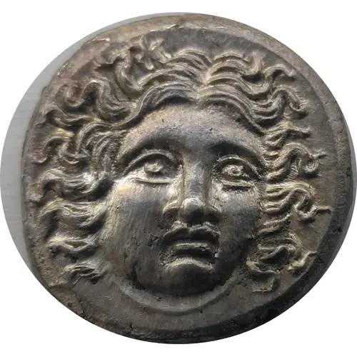 | Mô tả mặt trước | Head of Helios facing three quarters toward right, hair loose |