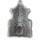 | Obverse description | The obverse is domed while the reverse is concaved. This structure enables multiple pieces to stack neatly into place. Given the complexity of the design, the precision necessary to enable each piece to click into place is truly astounding. The design itself is a genuine work of art. In it we see the image of a pawn across a silver shield-like surface. The design also includes the image of an actual shield beneath the pawn with a cross on its center. Meanwhile, the backdrop consists of a beautiful pattern that resembles a rose window. The shield’s design is quite ornate and recalls imagery found in old Cathedrals and other Medieval Gothic architecture. |