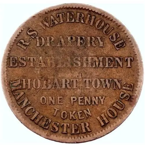 | 正面铭文 | R. S. WATERHOUSE DRAPERY ESTABLISHMENT HOBART TOWN MANCHESTER HOUSE ONE PENNY TOKEN |