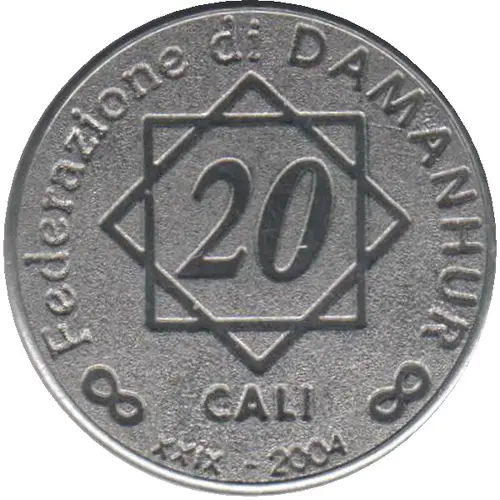 | Legenda del dritto | 20 CALI Federazione di DAMANHUR XXIX - 2004 (Translation: 20 CALI Federation of DAMANHUR XXIX - 2004) |