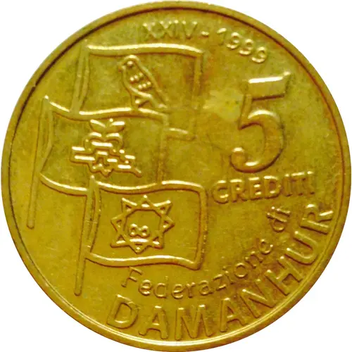| Opis líce | 5 CREDITI Federazione di DAMANHUR XXIV - 1999 (Translation: 5 CREDITI Federation of DAMANHUR XXIV - 1999) |