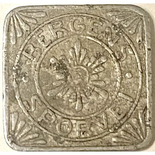 Descripción del anverso 2 inner circles 15.5mm and 10mm. The inner circle has flower like design. Legend between the two circles dots between words. Beems fill area from corners to the outside of larger circle.
