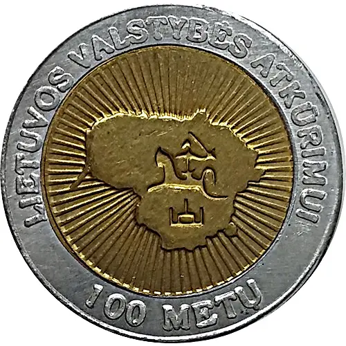 | Leyenda del anverso | LIETUVOS VALSTYBĖS ATKŪRIMUI 100 METŲ (Translation: 100th ANNIVERSARY OF THE RESTORED STATE OF LITHUANIA) |