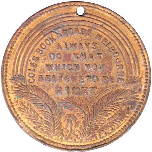 Obverse lettering COLE`S BOOK ARCADE MELBOURNE ALWAYS DO THAT WHICH YOU BELIEVE TO BE RIGHT