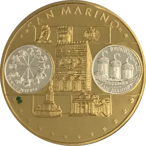 | Aversbeschreibung | The theme of San Marino`s first commemorative euro is `Welcome Euro`. The designer Uliana Pernazza has depicted this theme in an original and symbolic way on the coin. Twelve roses are depicted, symbolizing the original 12 countries of Europe. The text `Benvenuto Euro` completes the design. On the obverse of the coin, in addition to the indication of the issuing country, also the three towers that are also in the coat of arms of the coin. These represent the three citadels (La Guaita, La Cesta and La Montale) of San Marino. The feathers pictured above are ostrich feathers. The gilded issue then shows the parliament building in the center. The Basilica del Santo, which means Basilica of the Holy, is also beautifully displayed. Furthermore, the coat of arms and the statue of liberty are beautifully depicted. |