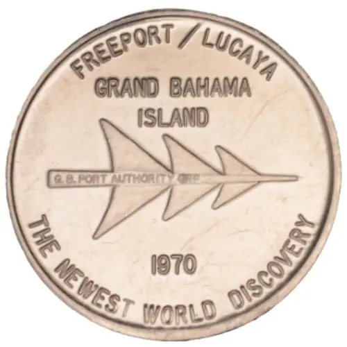 | Obverse lettering | FREEPORT / LUCAYA GRAND BAHAMA ISLAND G.B. PORT AUTHORITY GRE 1970 THE NEWEST WORLD DISCOVERY |