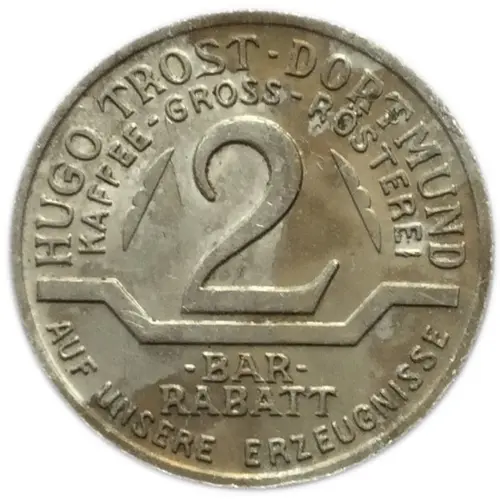 | نوشتههای روی توکن | HUGO TROST - DORTMUND KAFFEE - GROSS - RÖSTEREI 2 - BAR - RABATT AUF UNSERE ERZEUGNISSE (Translation: Hugo Trost Coffee Roasting House 2 Cash Discount On our products) |