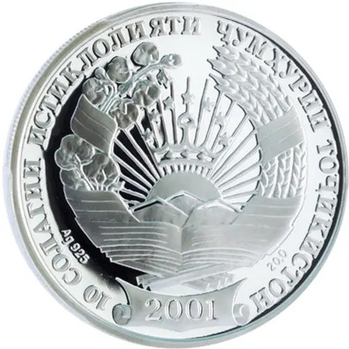 | Obverse lettering | 10 СОЛАГИИ ИСТИКЛОЛИЯТИ ЧУМХУРИИ ТОЧИКИСТОН Ag 925 20.0 2001 (Translation: 10 years of independence of Tajikistan) |