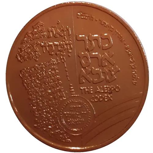 Légende de l’avers כתר ארם צובא THE ALEPPO CODEX וזאת הברכה `קודש לה` לא ימכר ולא יגאל` שלמה בן בויאעא אהרון בן-אשר הרמב`ם