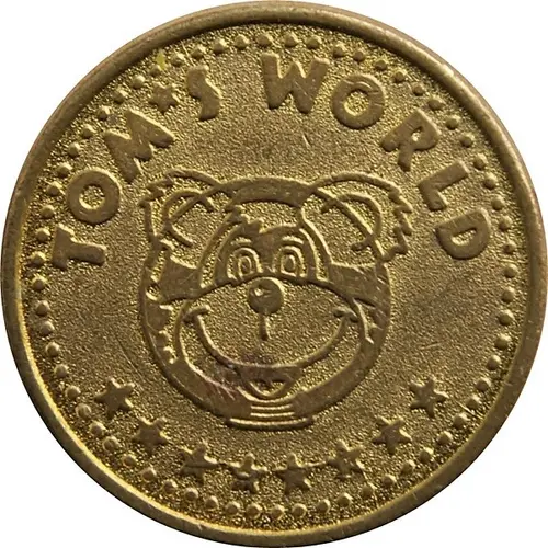 | Reverse lettering | Tom`s 歡樂世界 World 湯姆熊 遊樂場專用幣 (Translation: Tom`s World For Amusement Only) |