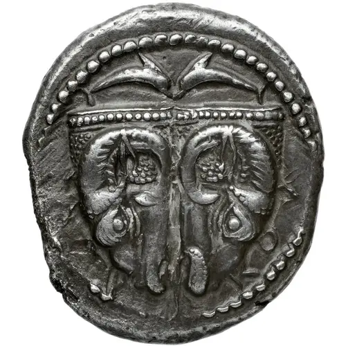 | Описание аверса | Two rhyta (drinking vessels) in the form of rams’ heads; above, two dolphins confronted; ΔAΛΦ-I-KON in small letters below; all within beaded border |