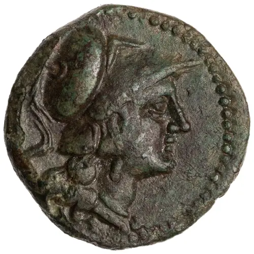 | Aversbeschreibung | Helmeted head of Athena right; four pellets (mark of value) behind. |