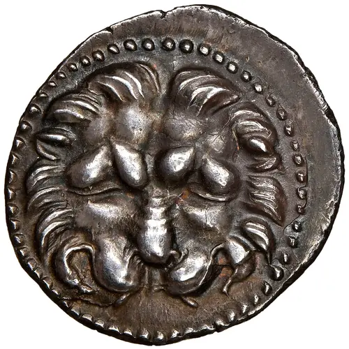 Descripción del anverso Lion scalp facing, seen from above.